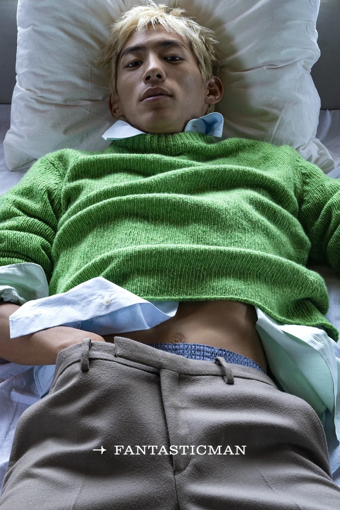 绿色毛衣采用羊绒粗纺绳绒纱线编织而成,面料呈现出浓郁的色彩,同时搭配了蓝色埃及长绒棉衬衫与卡其色轻盈麦尔登呢西裤。服饰均为 Auralee。开篇图中粉色薄透毛衣选用稀有苏利小羊驼毛,搭配丝棉混纺衬衫和轻盈麦尔登呢长裤。
