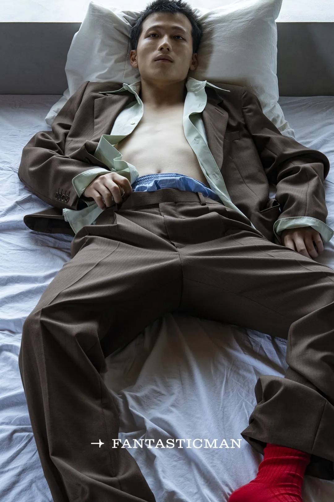 模特名须翼(Tsubasa Nasu),25 岁。喜欢看电影,也喜欢看萌宠视频。他身着羊毛西装和浅卡其色衬衫。